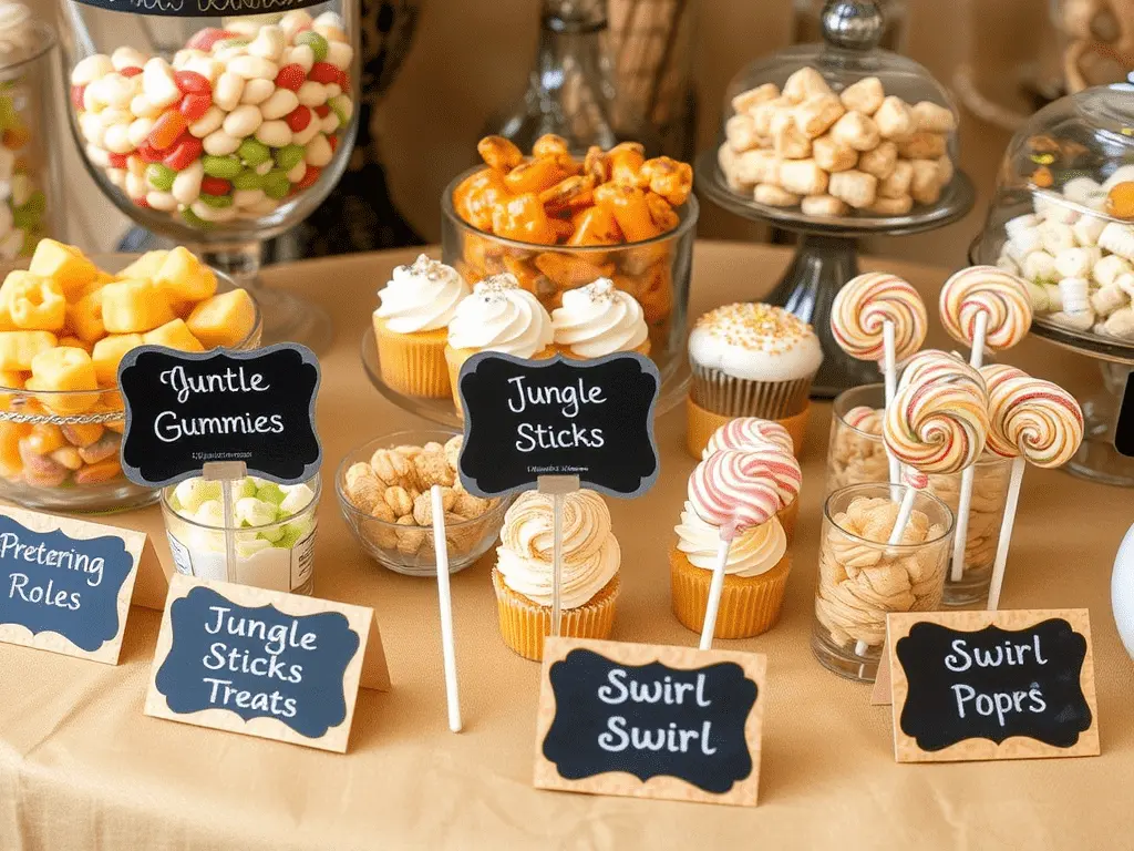 Give each sweet on the table its own safari inspired name printed on a custom food tent card. Refer to your gummy candies as “Watering Hole Gummies,” call your pretzel rods “Jungle Sticks,” name your cupcakes “Lion Mane Treats,” and label your lollipops “Safari Swirl Pops.” These creative naming details delight guests and give the table personality that standard presentation cannot achieve.