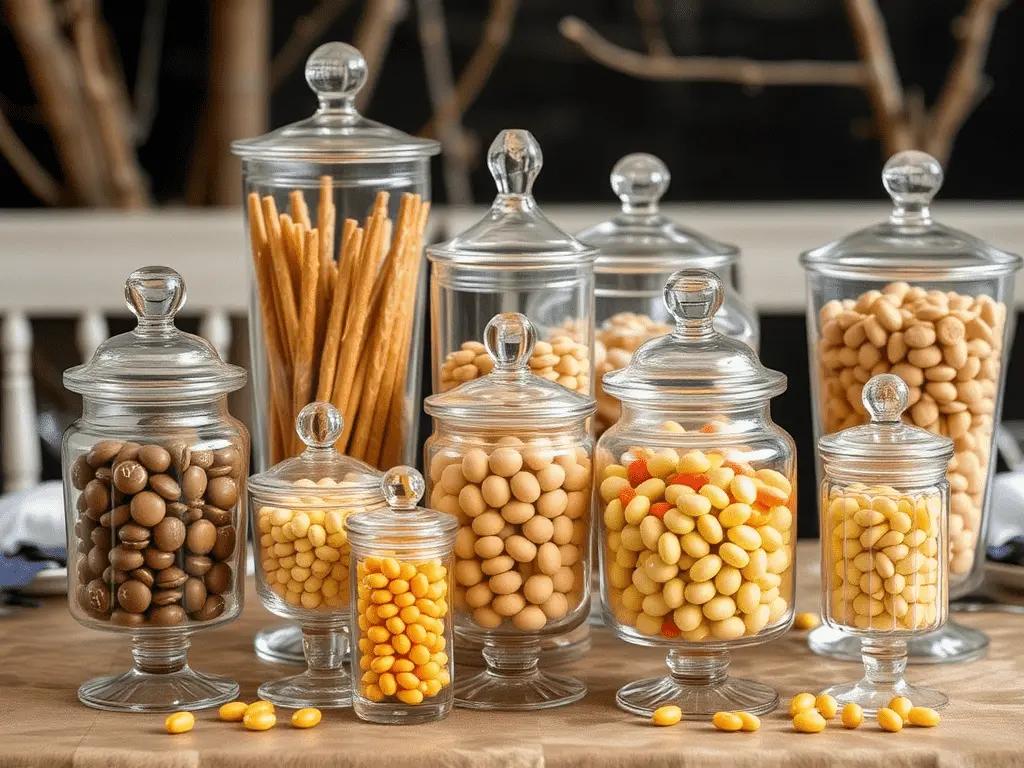 Grouping tall, medium, and short jars together in clusters across the table creates natural height variation that prevents the display from appearing flat or monotonous. Taller jars work well for pretzel rods and lollipops while shorter jars suit gummies, chocolates, and small round candies. This variation generates visual depth that draws the eye naturally across the full length of the table.