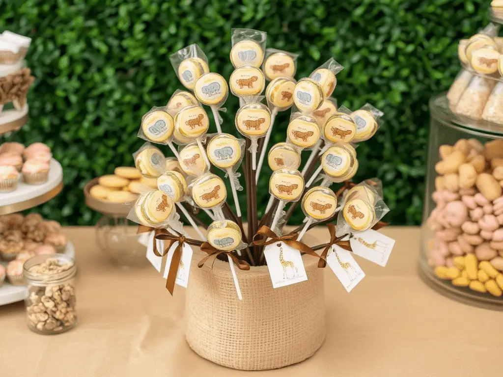 Wrapping individual lollipops in cellophane tied with brown or green ribbon and attaching a small illustrated tag featuring a lion, elephant, or giraffe makes each lollipop feel like a small gift. This level of detail transforms an ordinary candy into a thoughtful party favor and gives the entire table a sense of generous hospitality.