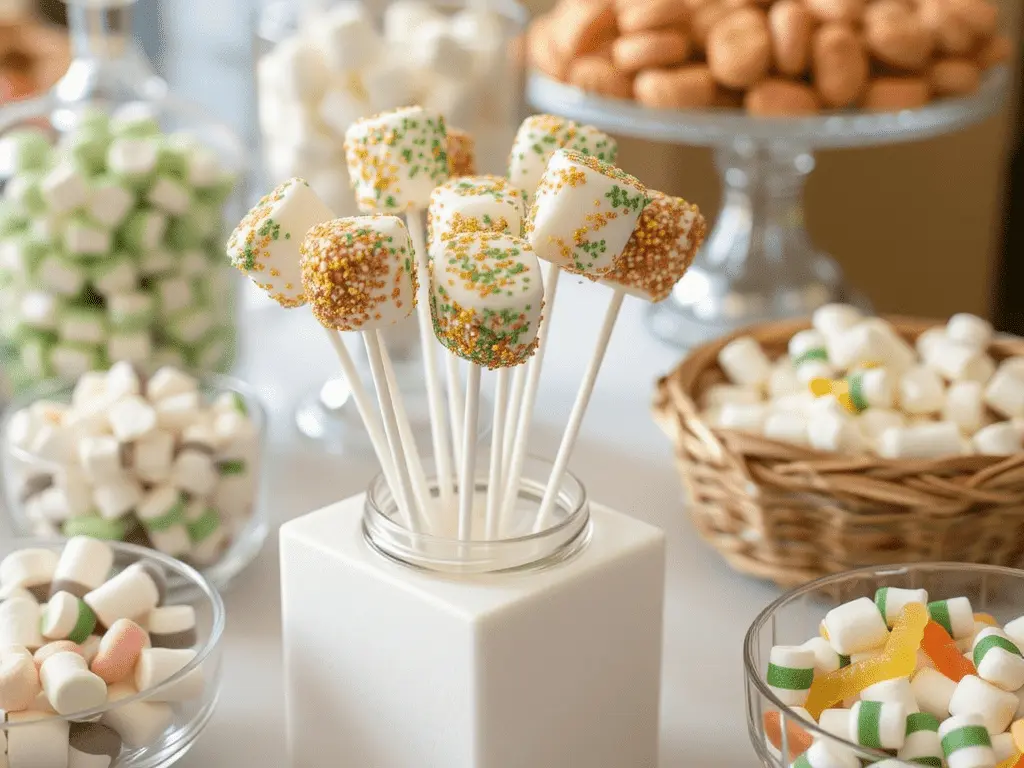 Large marshmallows dipped on sticks into colored candy melts in green, brown, or gold and rolled in coordinating sprinkles before the coating sets are simple to make in large quantities and look far more impressive than the minimal cost and effort required. Display them upright in a small jar or foam block within the candy bar section of the table.
