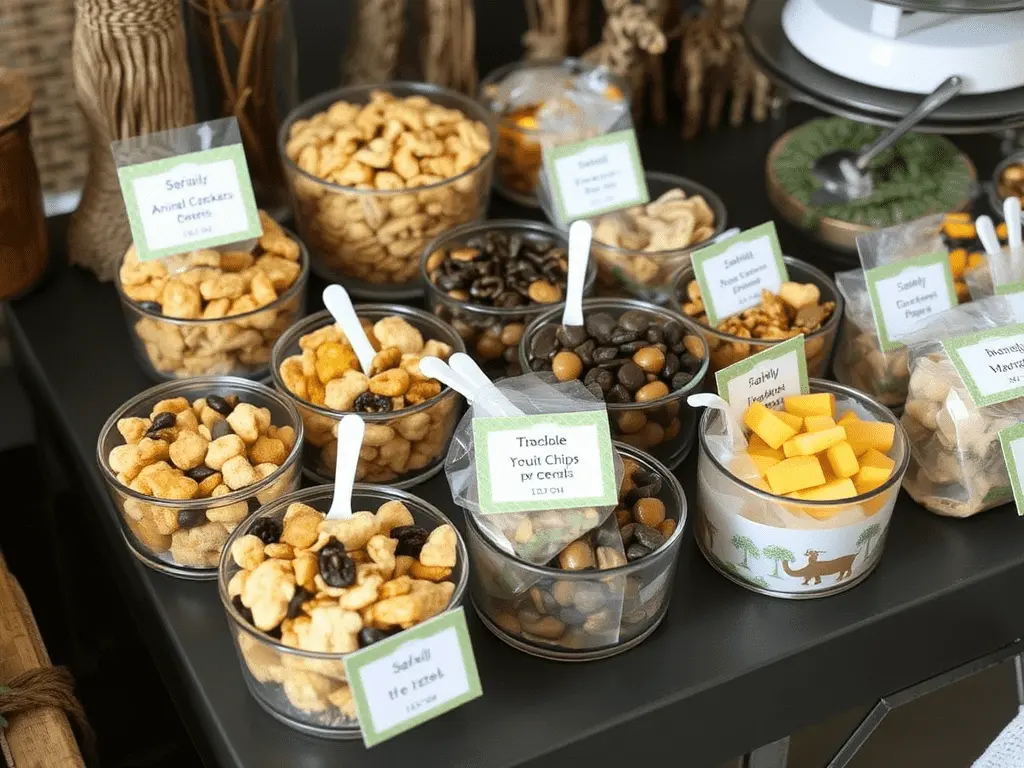 Offer small labeled bowls of trail mix components including animal crackers, yogurt chips, fruit ring cereal, chocolate chips, mini pretzels, and dried mango pieces. Label each bowl with a playful safari inspired name and provide small scoops alongside personalized bags or cups so guests can build their own custom mixture to take home.