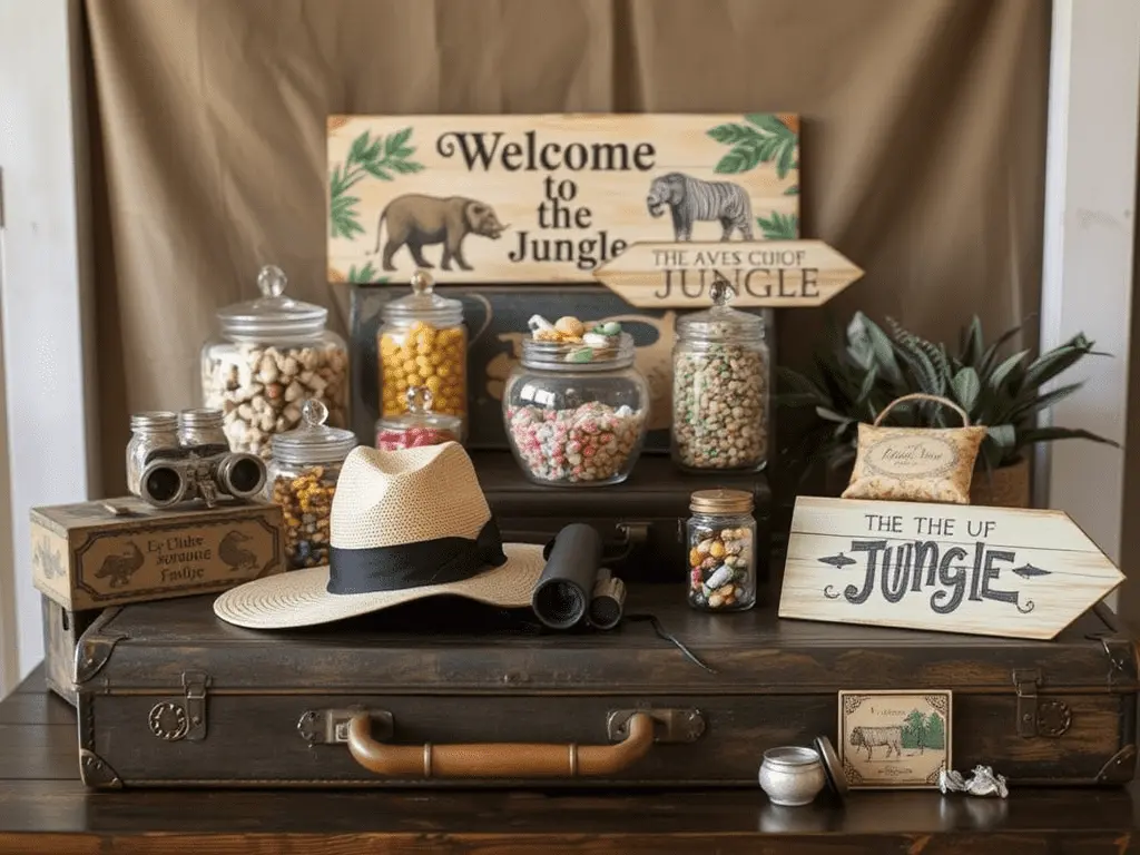 Vintage suitcases or trunk boxes positioned beside the candy table evoke the imagery of a real expedition adventure in a way that no printed decoration can replicate. Adding a pair of binoculars, a safari hat placed casually on the table surface, or a vintage compass nestled among the candy jars deepens the thematic narrative and gives the overall setup a genuine sense of character and history.