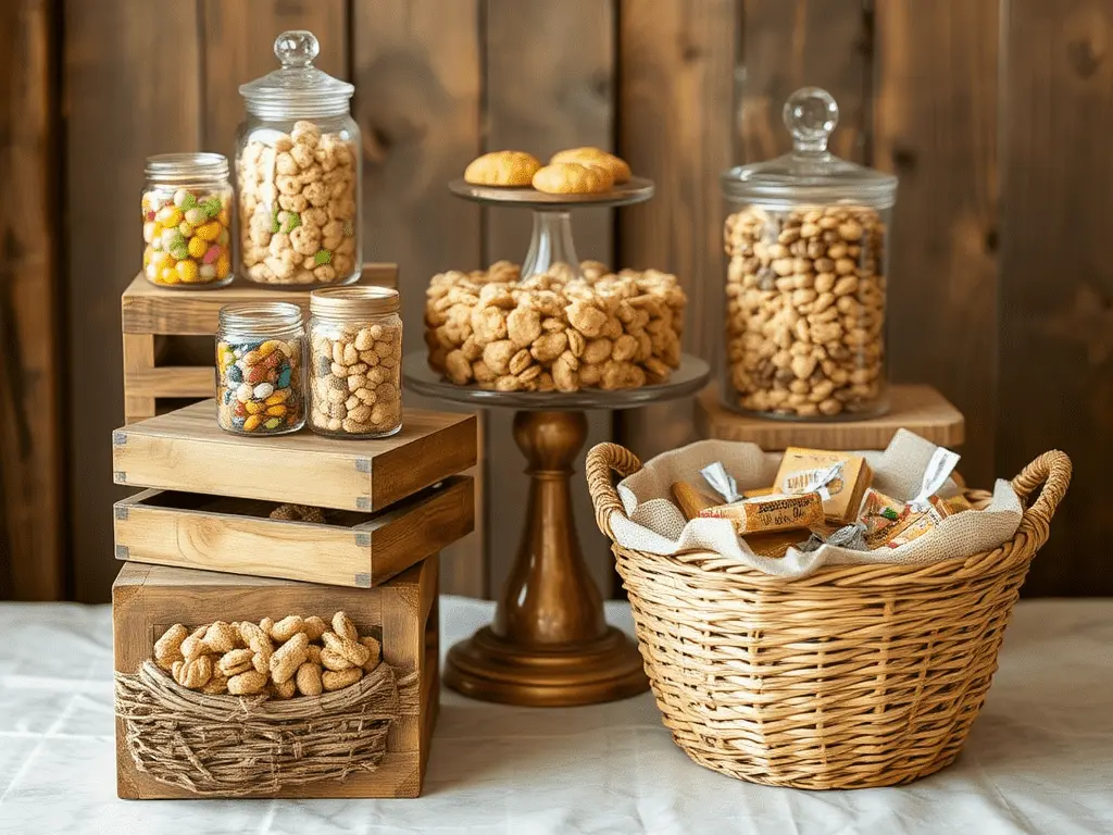 Natural materials introduce authenticity and tactile richness to a safari candy table that synthetic containers cannot replicate regardless of their design quality.