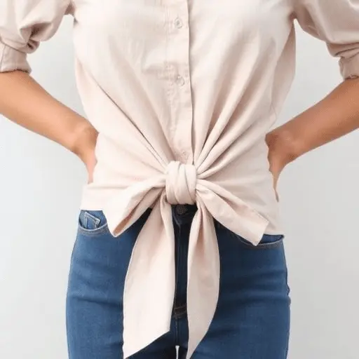 Reach through the slit and grab the front center fabric of the shirt from just below the bust line. Pull it gently through the slit and twist it once before letting it settle. The twist creates a gathered, sculptural knot at the front center of the shirt that draws the eye and creates a flattering focal point at the waist.
