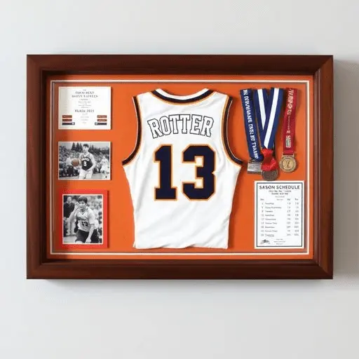 For a basketball-specific display, pair the varsity letter with a team roster card, a photograph from a defining game, the athlete’s jersey number rendered in vinyl, any championship medals or ribbons earned during the season, and the official season schedule card. A walnut or cherry wood frame with a rich mat in team colors gives this type of display a polished, professional appearance.