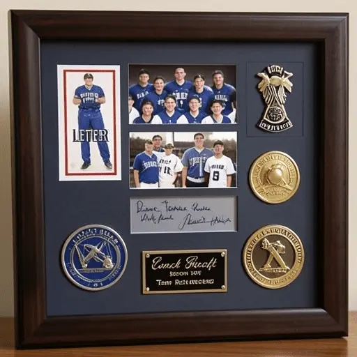 One of the most thoughtful varsity letter shadow box ideas you can create is a tribute to the coach who made the achievements possible. Assemble a shadow box that includes the team’s varsity letter, a team photo signed by every athlete, a team-signed mat board, award medals from the season, and a custom engraved nameplate that reads the coach’s name along with the season year and team record. This gesture acknowledges the human behind every achievement displayed inside the frame.
