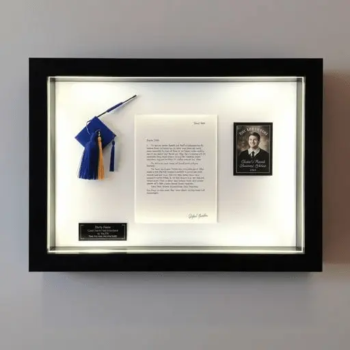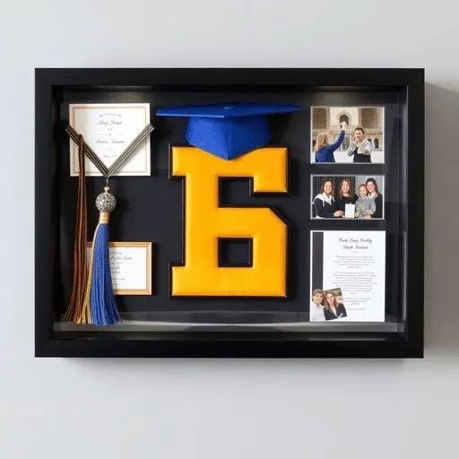 A graduation keepsake shadow box combines the varsity letter with major academic and ceremonial milestones. Include the graduation tassel, an invitation to the ceremony, honor cords, a National Honor Society stole if applicable, and photographs from graduation day. This all-in-one display captures the entire arc of a high school career and serves as a meaningful gift from parents or grandparents.