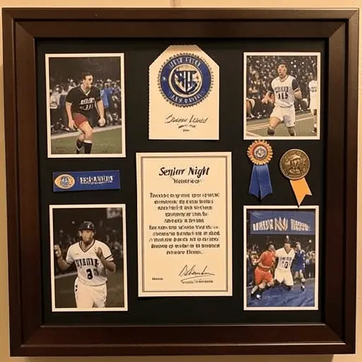Senior night is one of the most emotionally charged moments in a high school athlete’s career. Honor it with a shadow box built around photographs from that specific evening, the varsity letter, a short printed tribute featuring the athlete’s name and years of service, and small tokens from the final season such as ribbons, pins, and a signed program. This display captures a moment that passes quickly but deserves to be remembered forever.