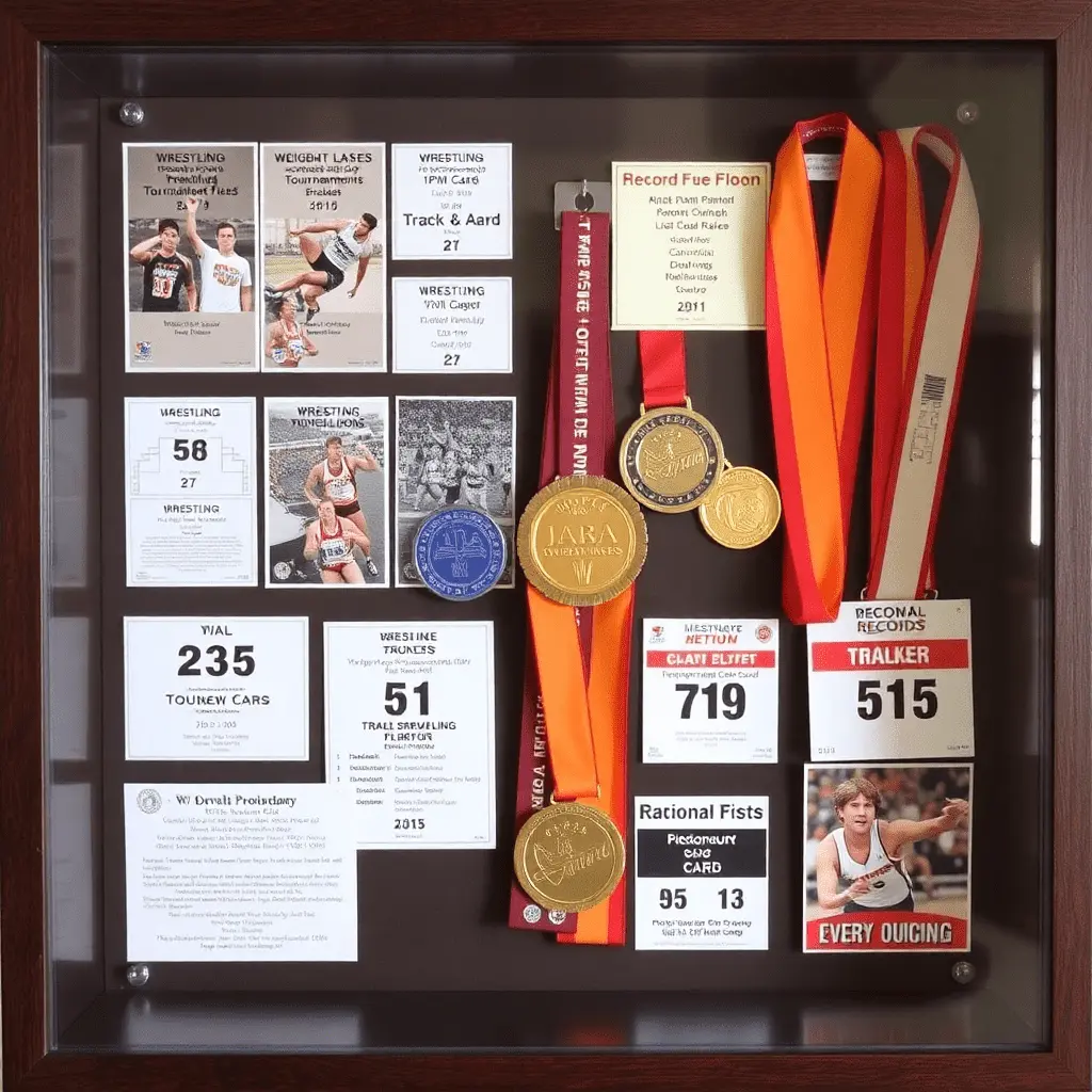 Wrestling athletes have a particularly rich set of memorabilia to work with, including weight class designation cards, tournament brackets, regional or state medals, and action photographs. Track and field athletes can add race bibs from significant competitions, ribbons, a record card listing personal bests, and a photograph from a breakthrough race. Both sports have compelling stories to tell, and a well-designed shadow box honors every chapter.